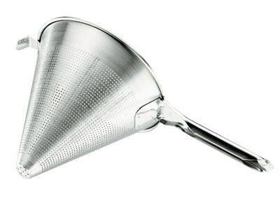 Colador que tiene forma cónica construido generalmente de acero inoxidable y que es utilizado para filtrar la fase solida de la liquida en un alimento en la cocina.